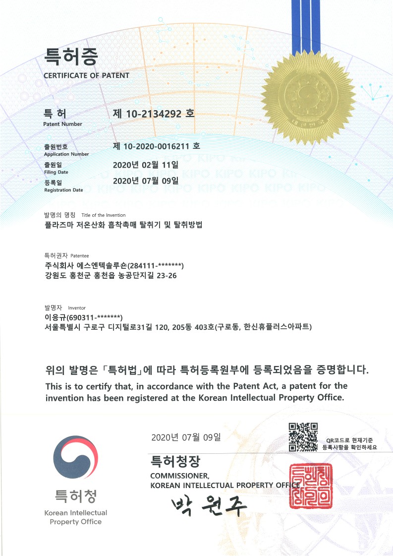 특허:제10-2134292호 플라즈마 저온산화 흡착촉매 탈취기 및 탈취방법